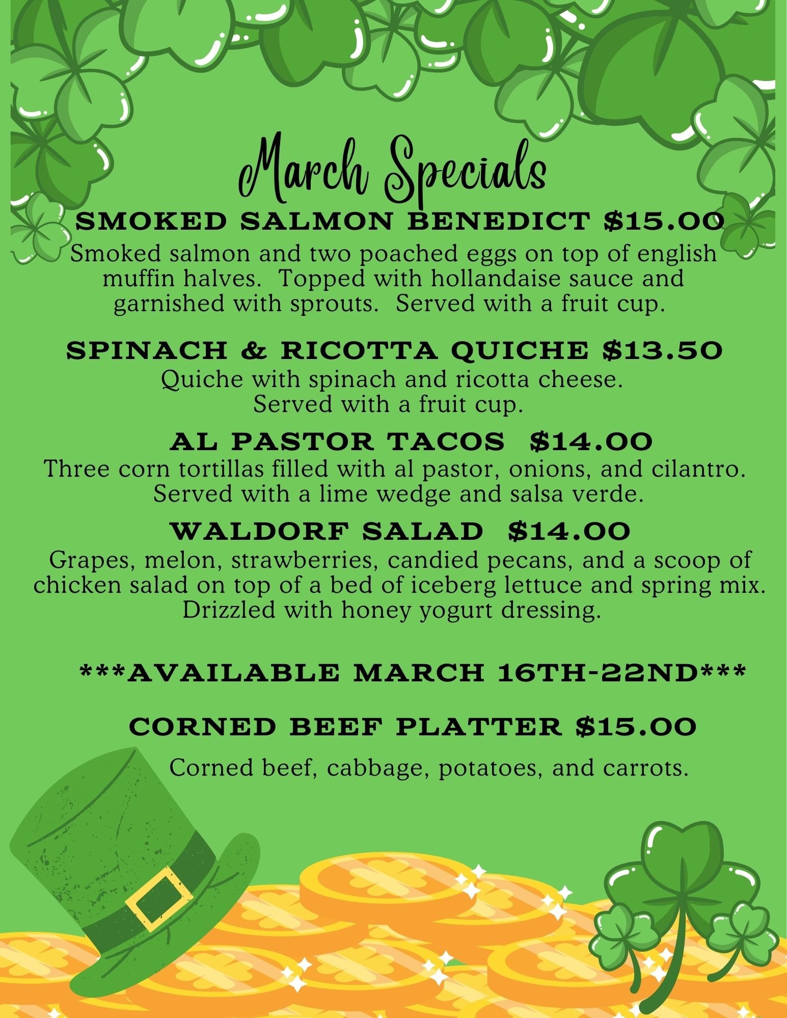 MENUS Order Online BreakfastServed all day everyday! LunchServed all day everyday! DinnerServed 2:30 PM - 8:00 PM Tuesday - Saturday!